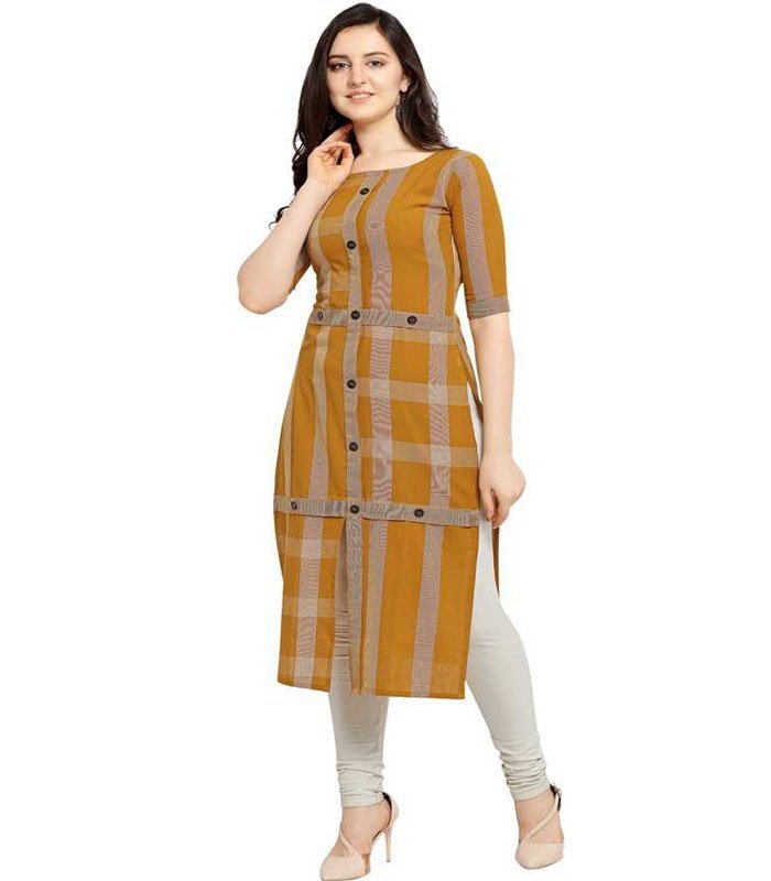 This beautifully Here Mustard Color Combination Of Kurti For Women?s And Poly Reyon Fabric It Has Boat Type Of Neck And Kurti Has 3/4 Sleeves Type Also Button Stylish Kurti It Has Stiched A For Attached A Fancy Look Very Fashionable Garments Also It Has A Button Has beautifully Pattern Kurti From Creation