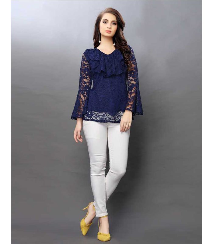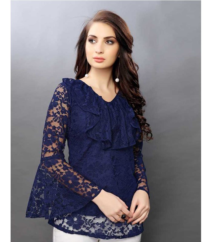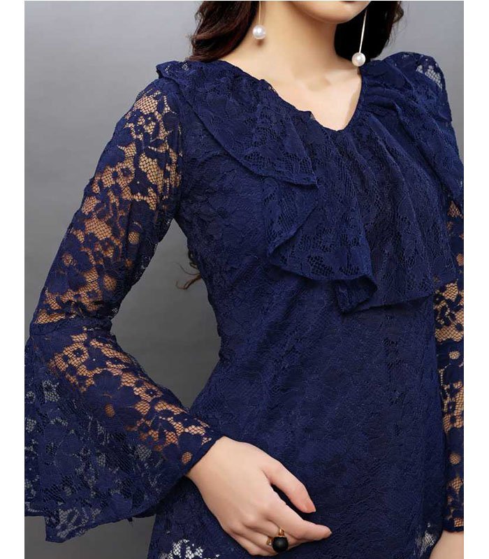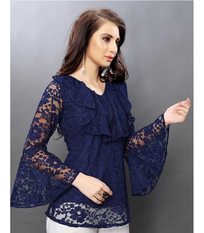 Navy Blue Semi Sheer Russel Net Top, has Ruffled Neck and Flared Sleeves