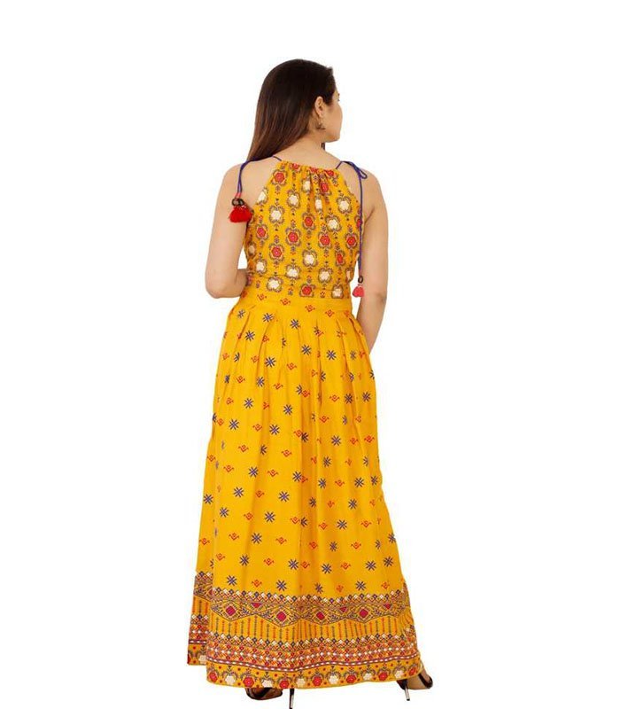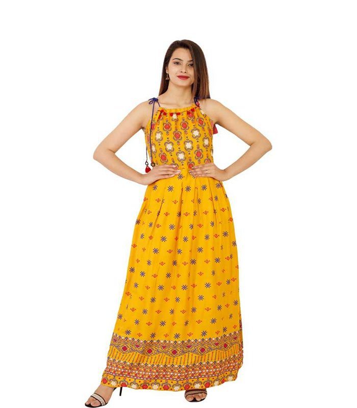 Comfortable Long Dress Jaipuri Printed in Rayon Fabric For Parties, Festivals and for wedding occasions even works fabulous in Clubs parties.